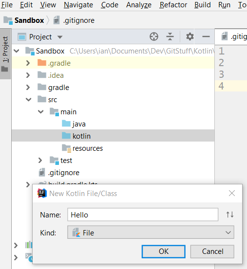 The new project will have a copy of ‘Hello.kt’ which you will normally wish to rename. Then make a test change and run the program (gradle may need a refresh first).