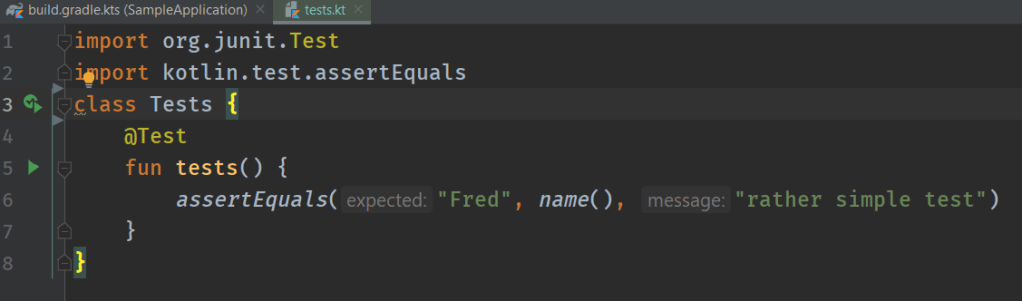 The programs now runs, so next up: tests. The same process is required for getting tests to work, with one extra step. The junit dependency is also required. Now the kotlin block in build.gradle.kts will look like: